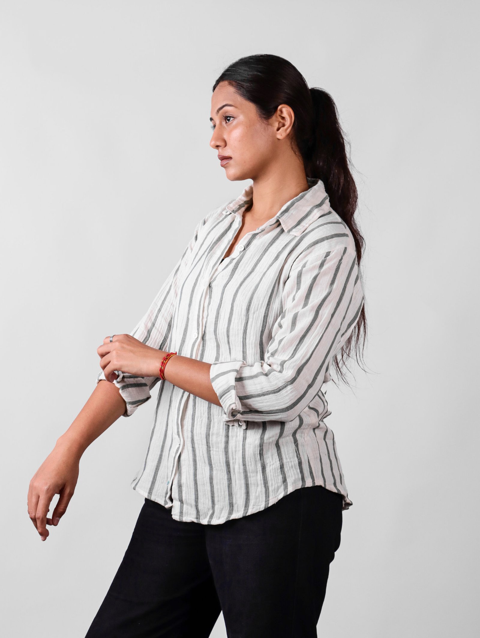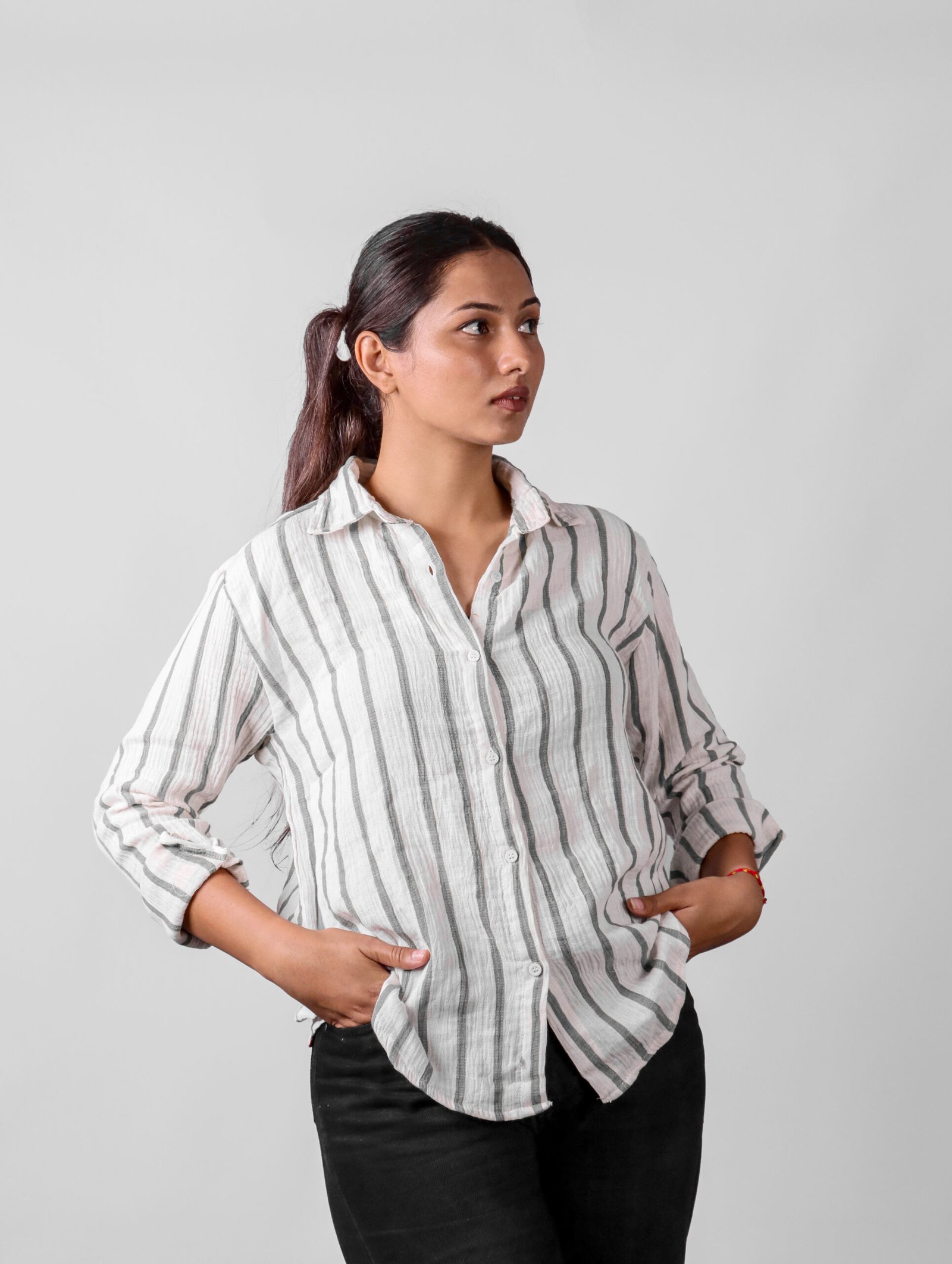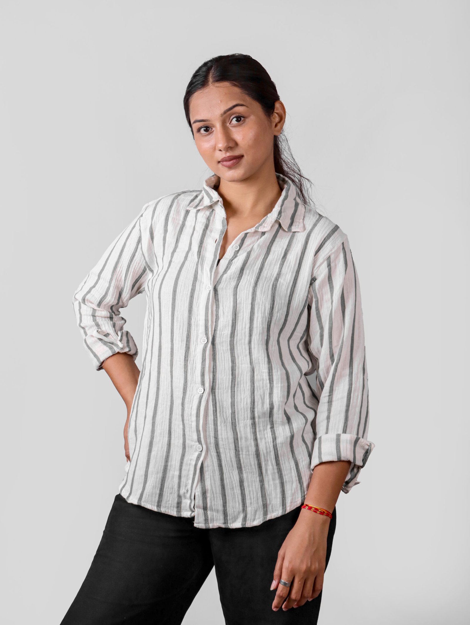 This striped women’s casual shirt is crafted from soft, breathable fabric, ideal for everyday wear. Featuring a classic collar and button-down design, it offers a comfortable fit and a trendy look.